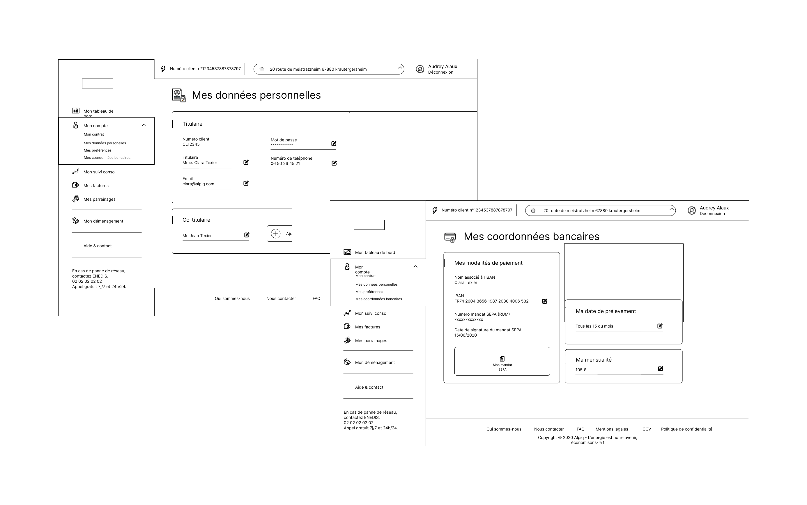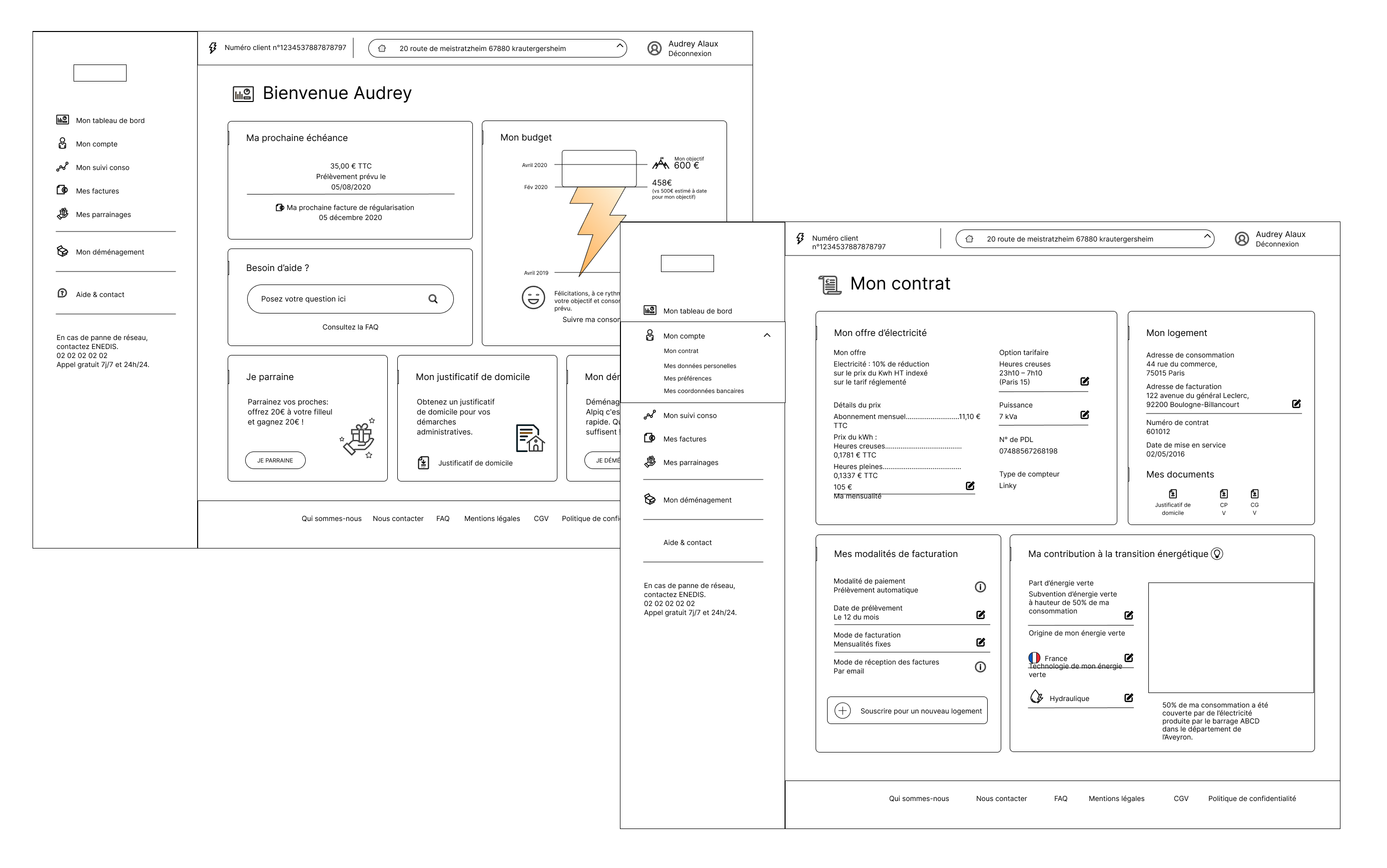 - Wireframes et prototypage : Sur la base des résultats des ateliers et des tests, j’ai développé des wireframes basse fidélité pour définir la structure de l’espace client. Ces maquettes ont été améliorées en haute fidélité avec des prototypes interactifs, testés auprès des utilisateurs pour validation.