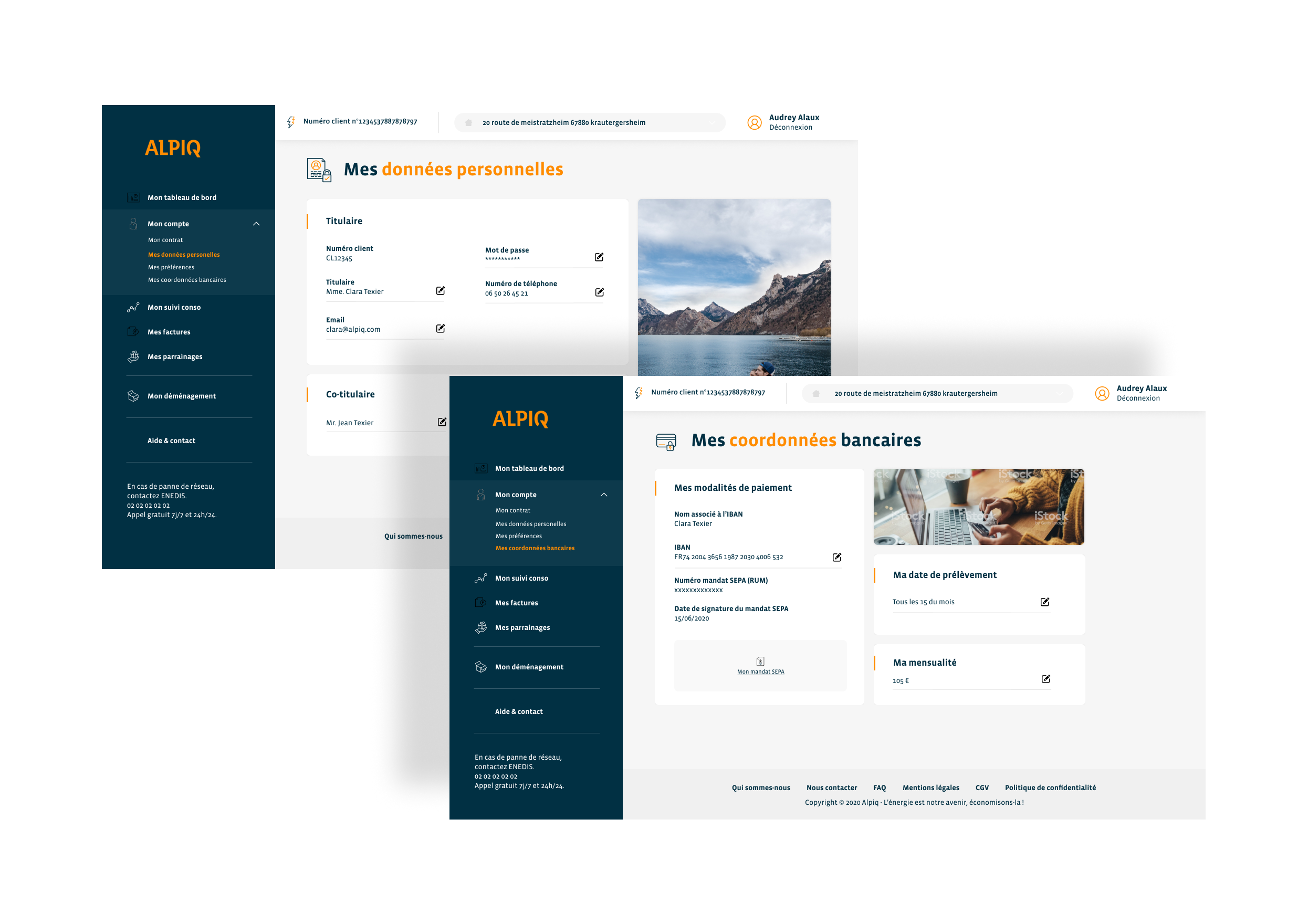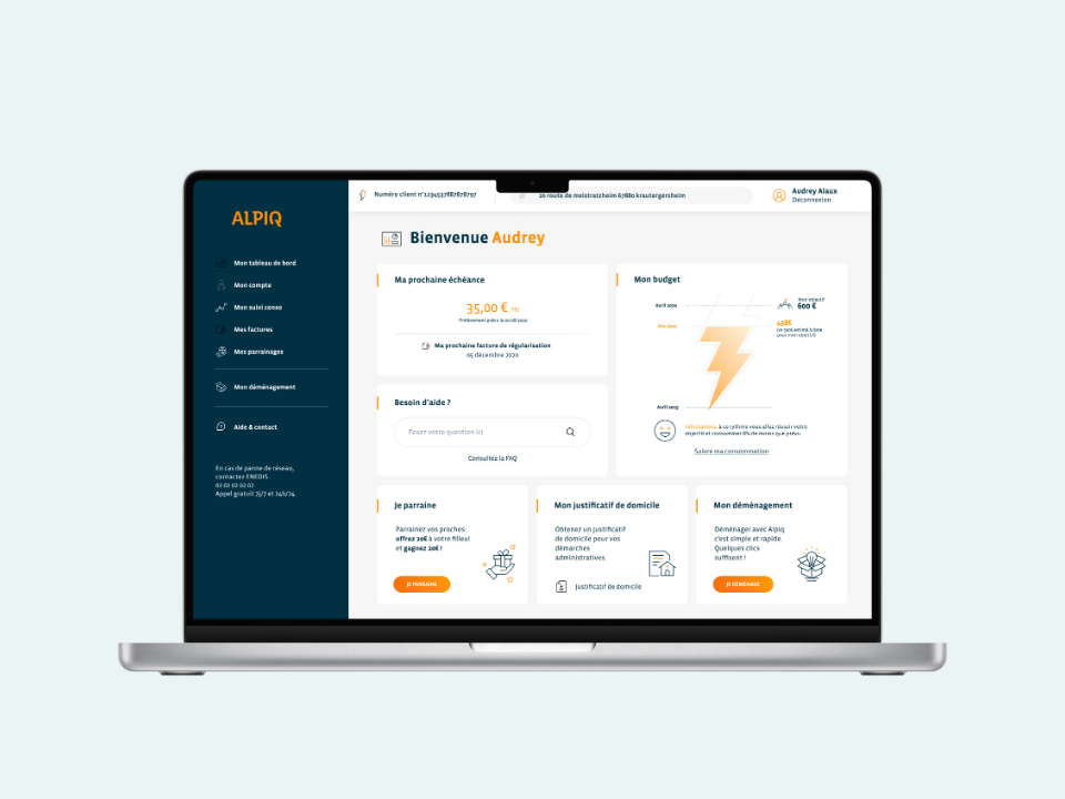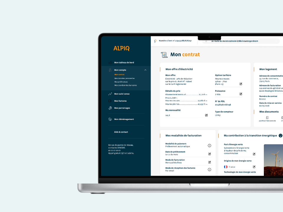 Alpiq, acteur majeur du secteur énergétique, avait besoin de concevoir un espace client intuitif permettant à ses utilisateurs de visualiser facilement leurs données de consommation, tout en leur offrant des fonctionnalités pratiques pour gérer leur compte et accéder à des services supplémentaires. Le défi était de rendre des données complexes accessibles de manière simple et fluide, tout en garantissant une expérience utilisateur premium.