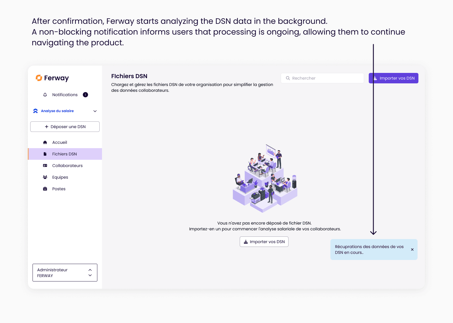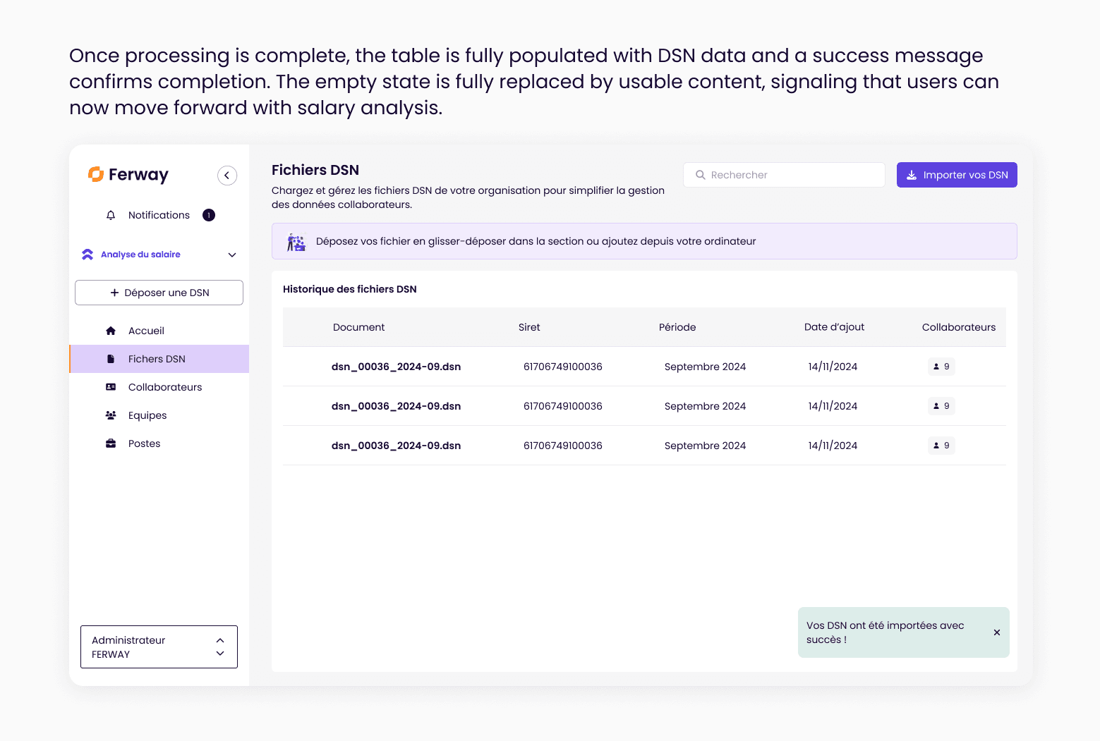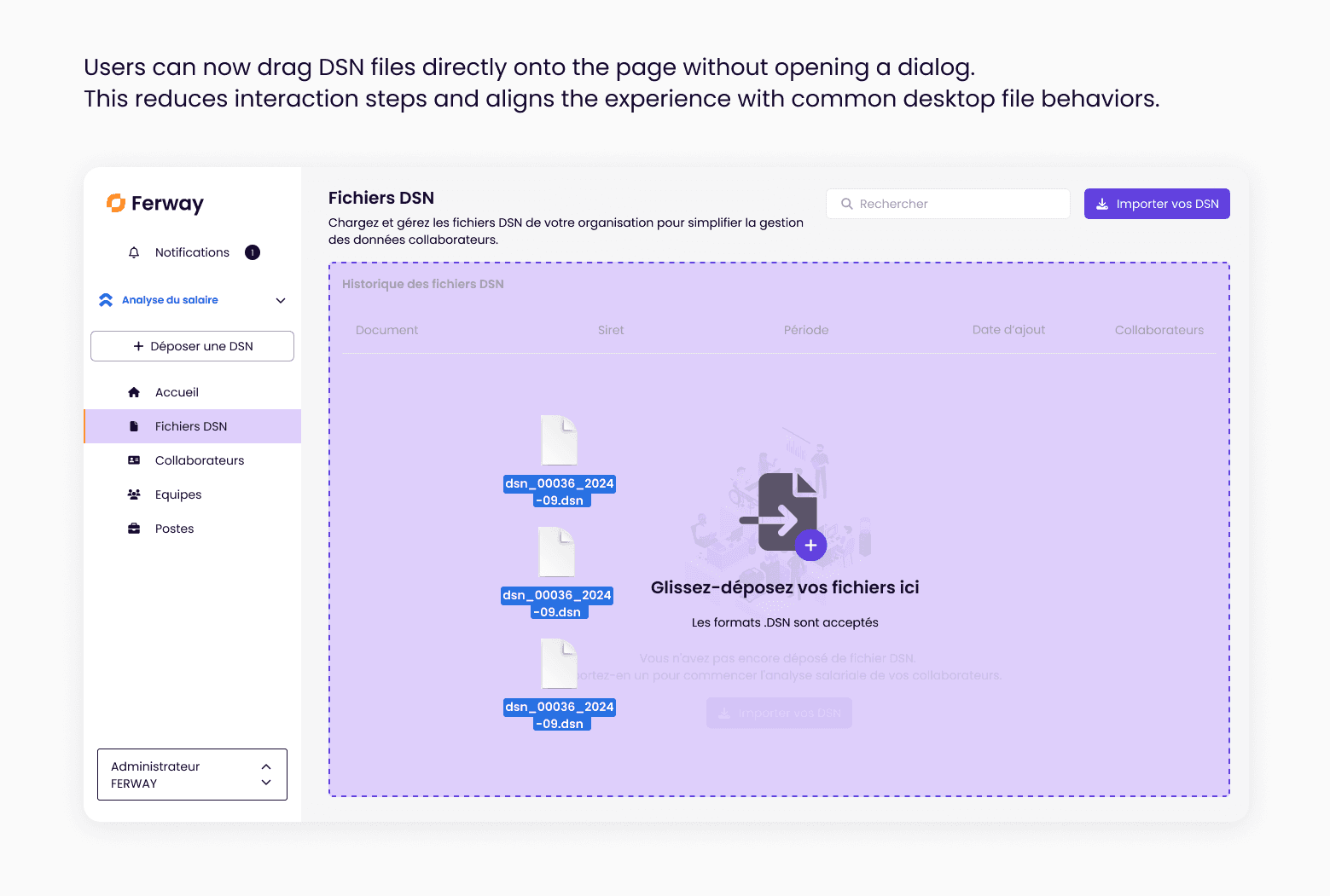 To address this, Ferway introduced DSN imports as a faster way to retrieve employee data automatically — creating employee profiles, positions, and salary-related information in seconds instead of hours.